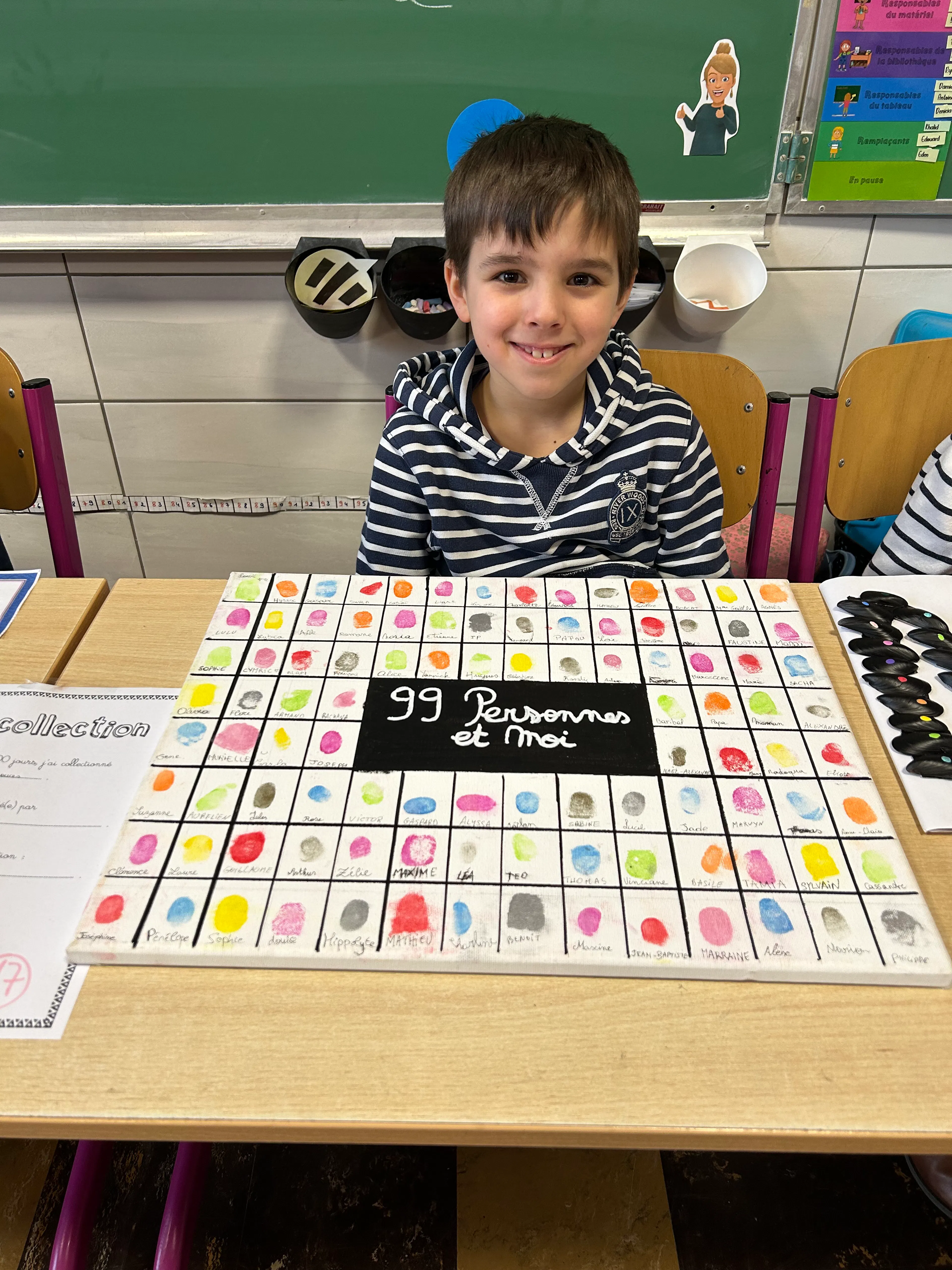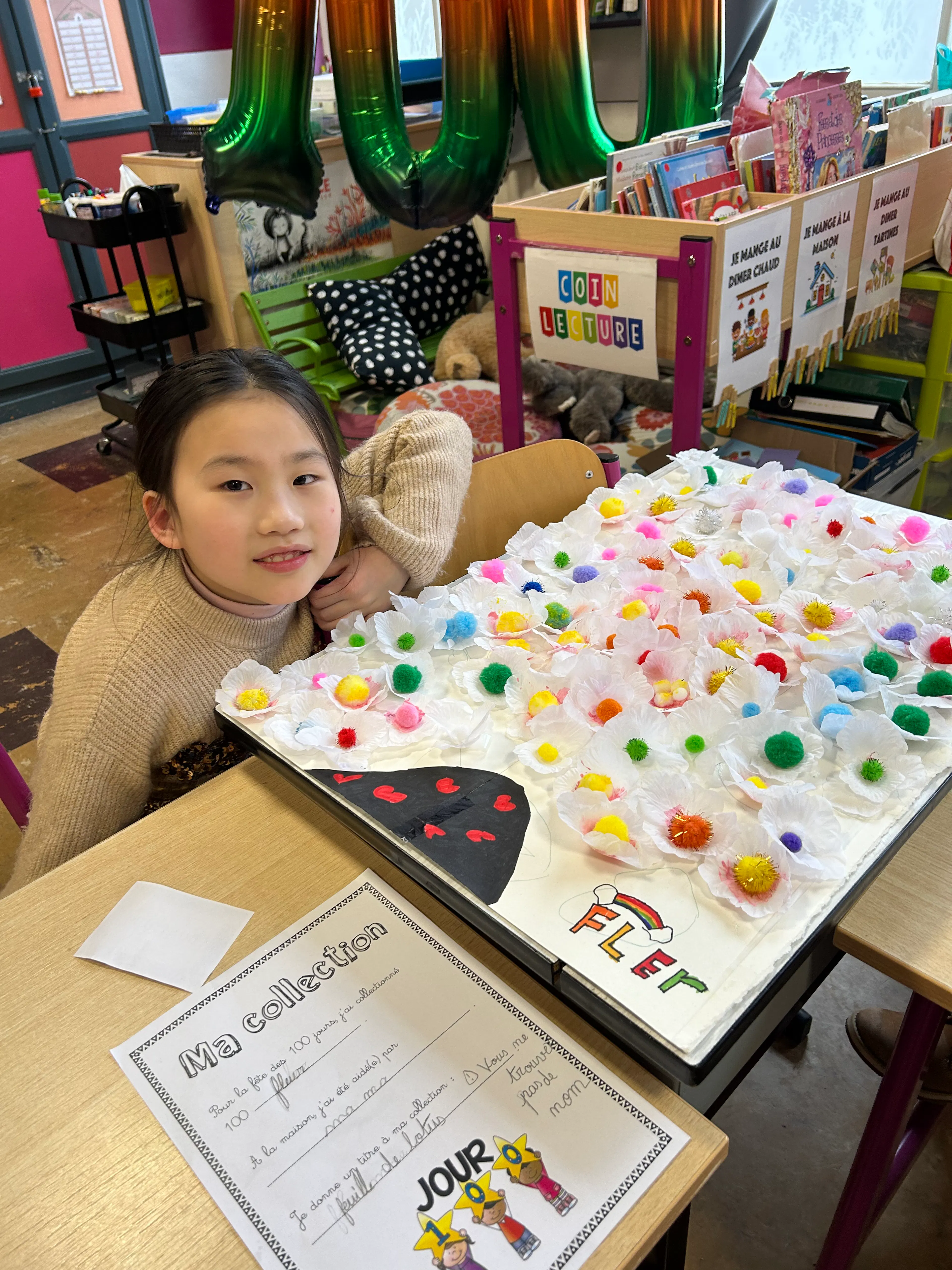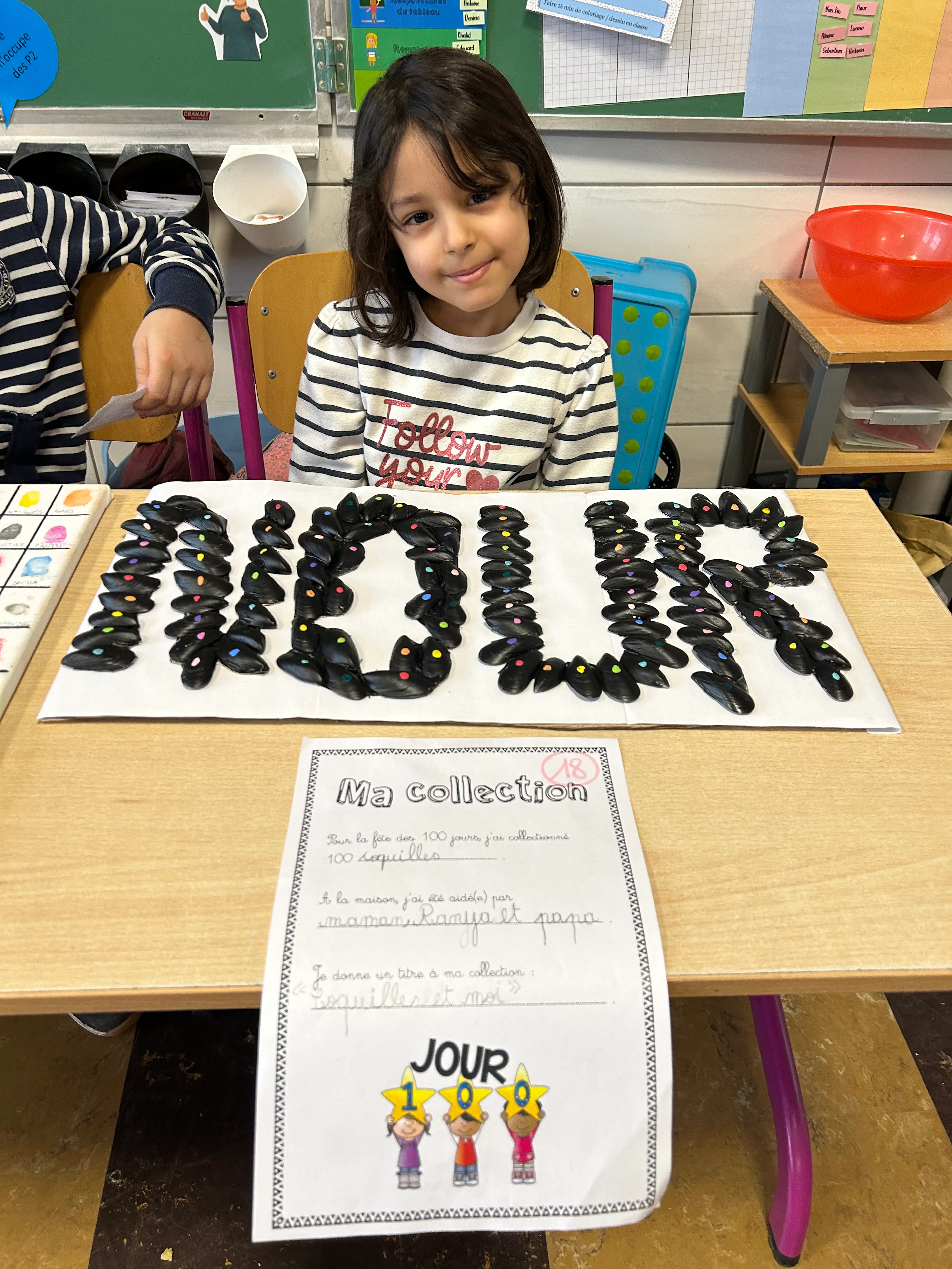 À travers des dessins, des collages, des assemblages d’objets et des idées originales, chaque enfant a exprimé sa vision du nombre 100. Bonhommes, cailloux, perles, mots, dessins répétés ou petits objets du quotidien ont pris vie dans des compositions uniques, témoignant de l’imagination débordante et de l’enthousiasme des jeunes artistes.